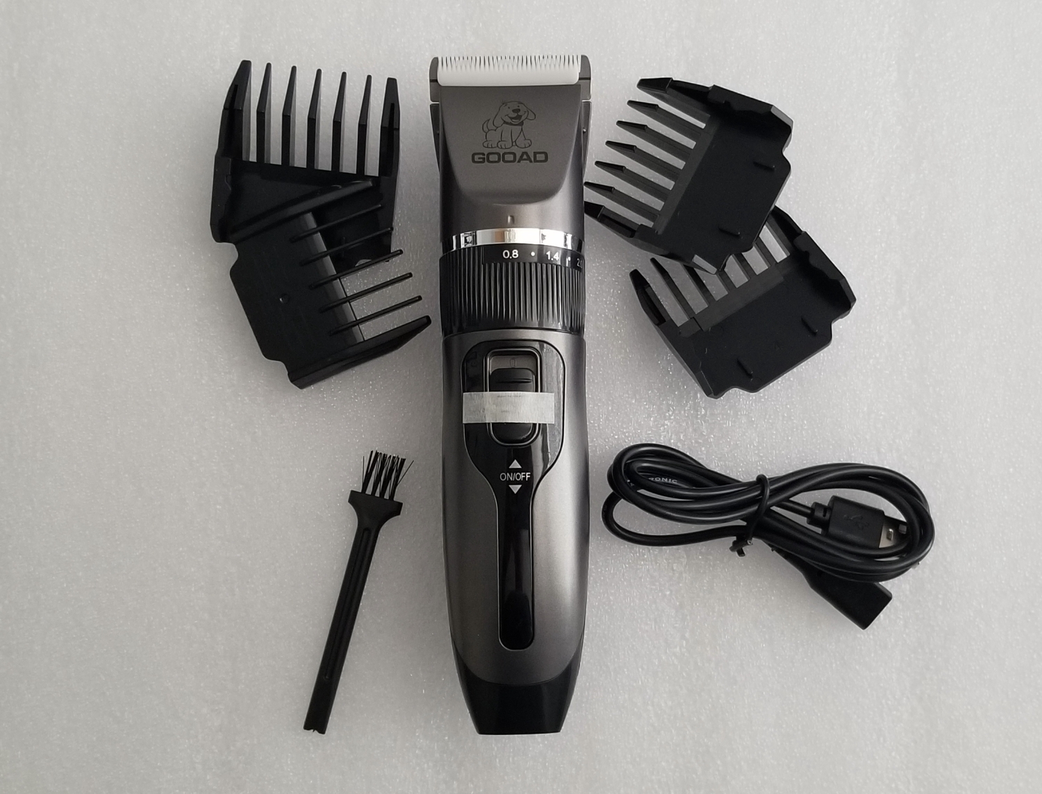 The Gooad clipper kit comes with a clipper, four guides, a USB charging cable, a bottle of blade oil, a steel comb, and a very nice zipped carrying/storage case.