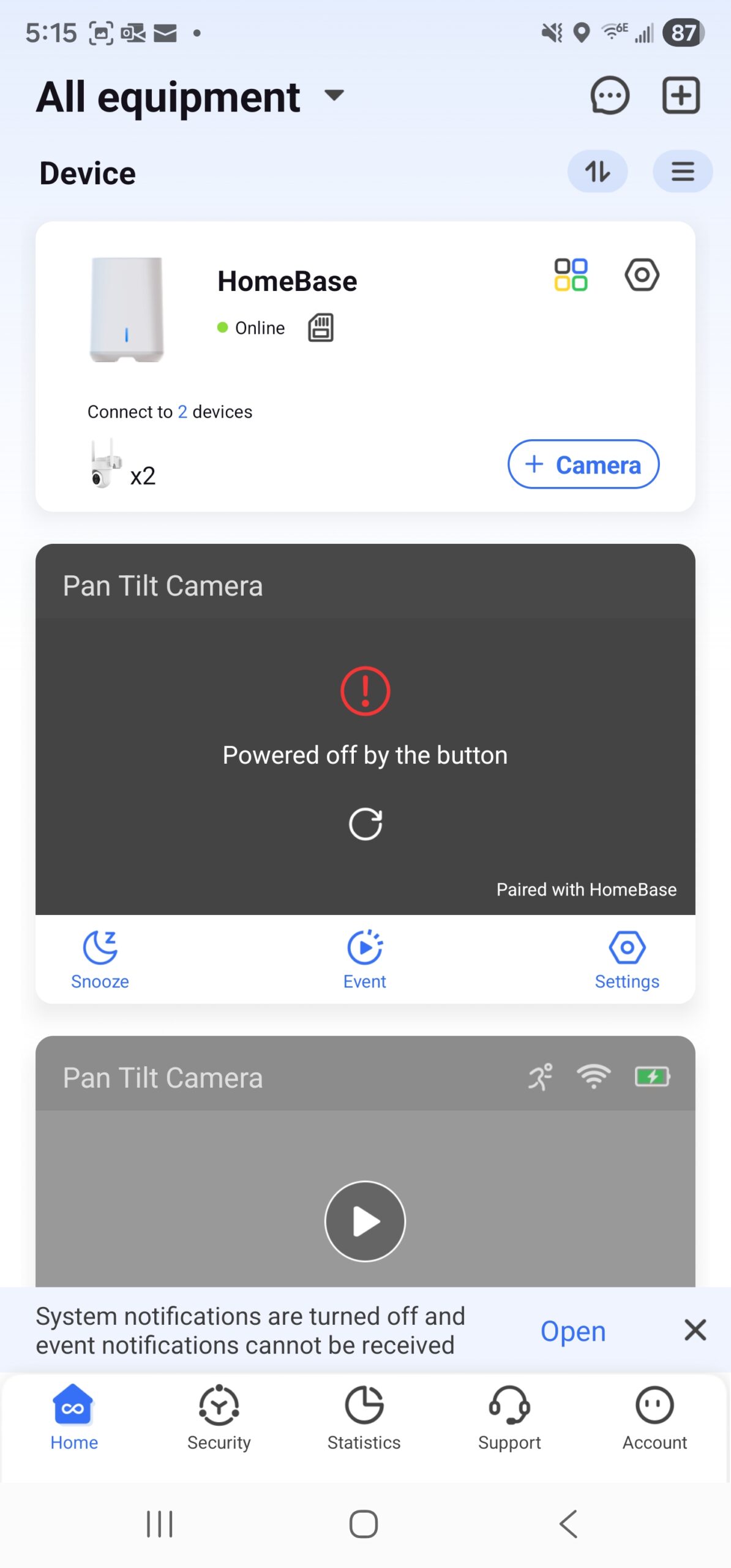 The app has Home, Security, Statistics, Support, and Account options. Home is where you can see the cameras and settings. In Security, you can set it to Home, Away, or Disarmed. It also displays all of the equipment (cameras). You can name each camera and also set each option for all cameras or for each camera individually, which is a great feature.